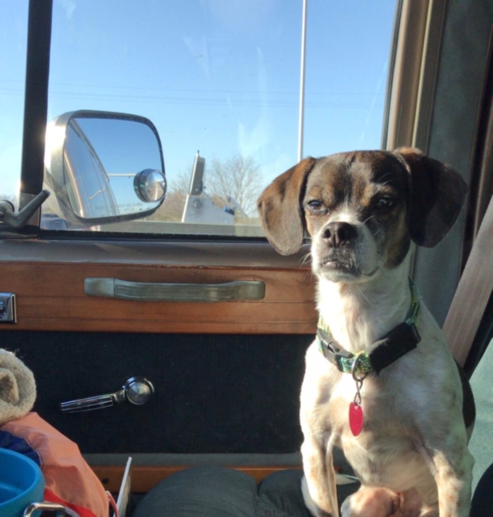 Despite my attempts to arrive before dark in order to already have dinner and the kitchen stowed back away so Hurley and I could be comfortable inside the van before the mosquitoes showed up, we hit traffic at the ferry on the Bolivar side and didn’t arrive at the park until sunset. Hurley’s face perfectly depicts how we were both feeling at this point in the drive!