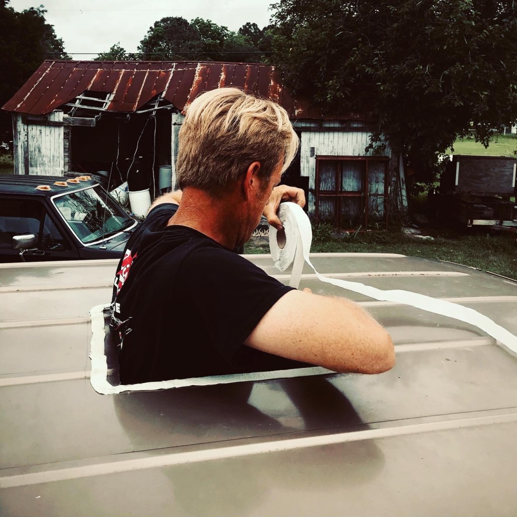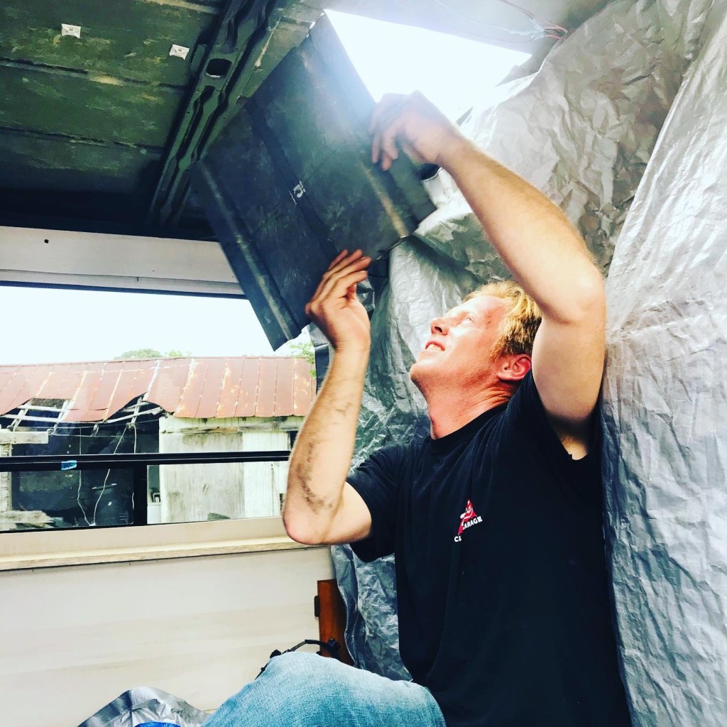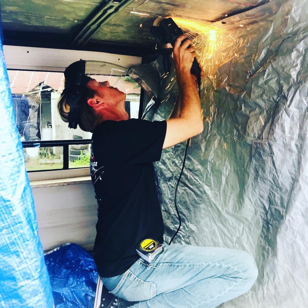 Mother’s Day weekend, I found myself back on the coast hanging out with my guys and the task of finally cutting the hole in the roof of the van. After another car show on the island, we made our way back to Derek’s and he got straight to work. I am forever grateful for his willingness to help with this part of the build out. We covered as much of the interior as possible to protect it from the sparks and metal pieces that would soon be flying around the van. Derek made his measurements, checking them twice, and then went for it! In a matter of seconds, we could see sunlight from the inside of the van.