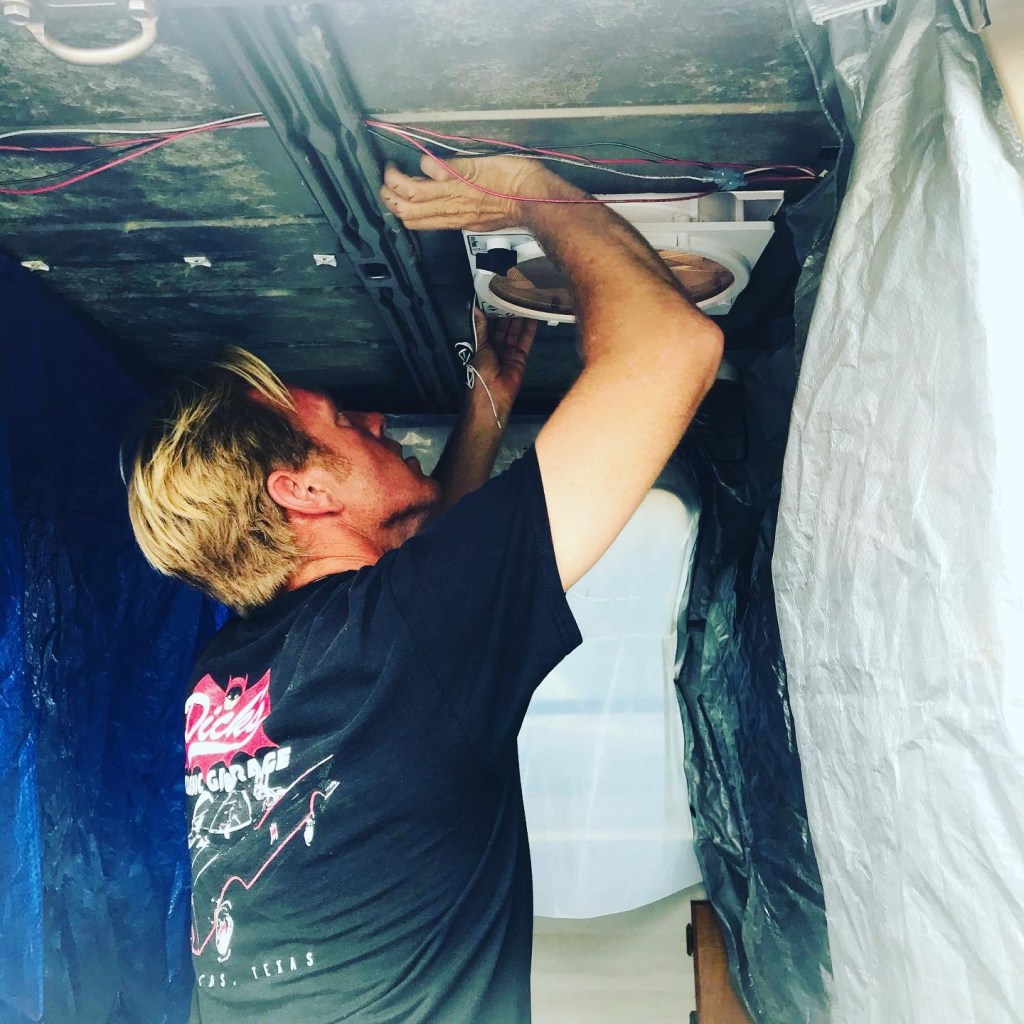 Once the hole was completely cut, and the raw metal sanded, we prepped the fan and readied the sealant.