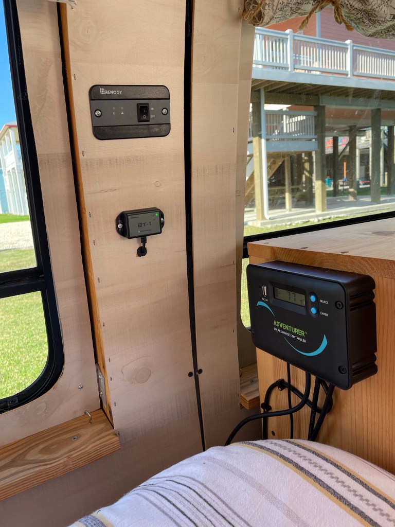 The 200W of solar power would control the MaxxAir fan, the lights installed in the ceiling boards, a USB port we added in the back for charging devices, and a 700W inverter.