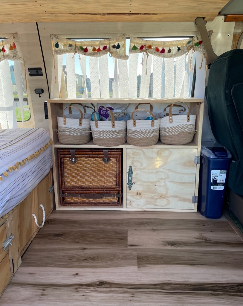 With the rest of the cabinet, I created a space for a picnic basket that I found years ago from an antique store. This basket has gone on many camping trips and served as my pantry. I also added four baskets for extra storage. These have given me the perfect space to store pup dishes and toys, games, and other essentials. While all of the solar components are tightly squeezed in their space, the cabinet turned out perfect!