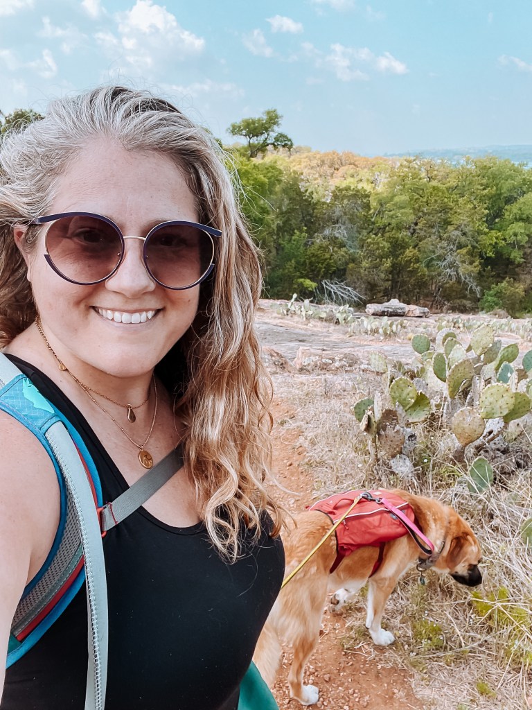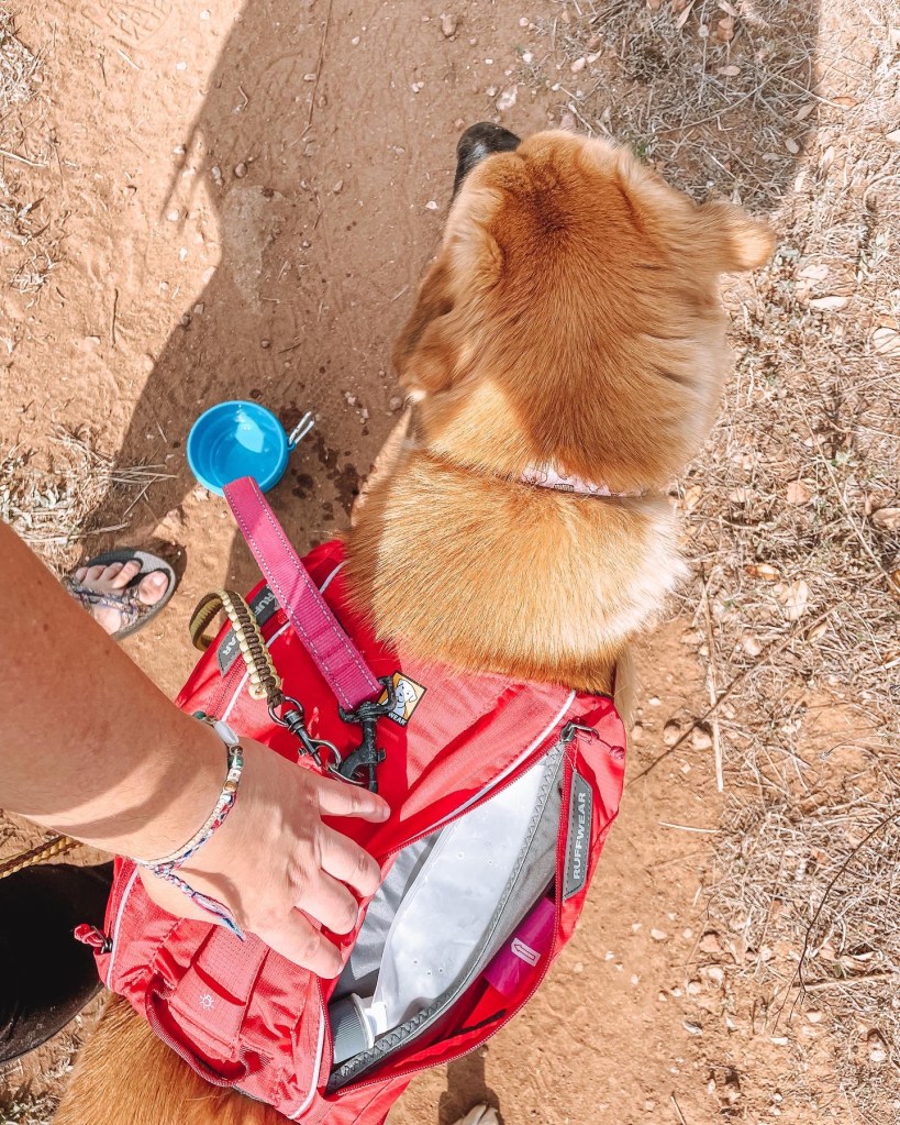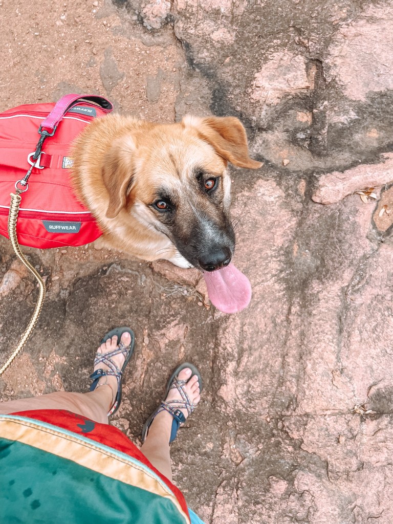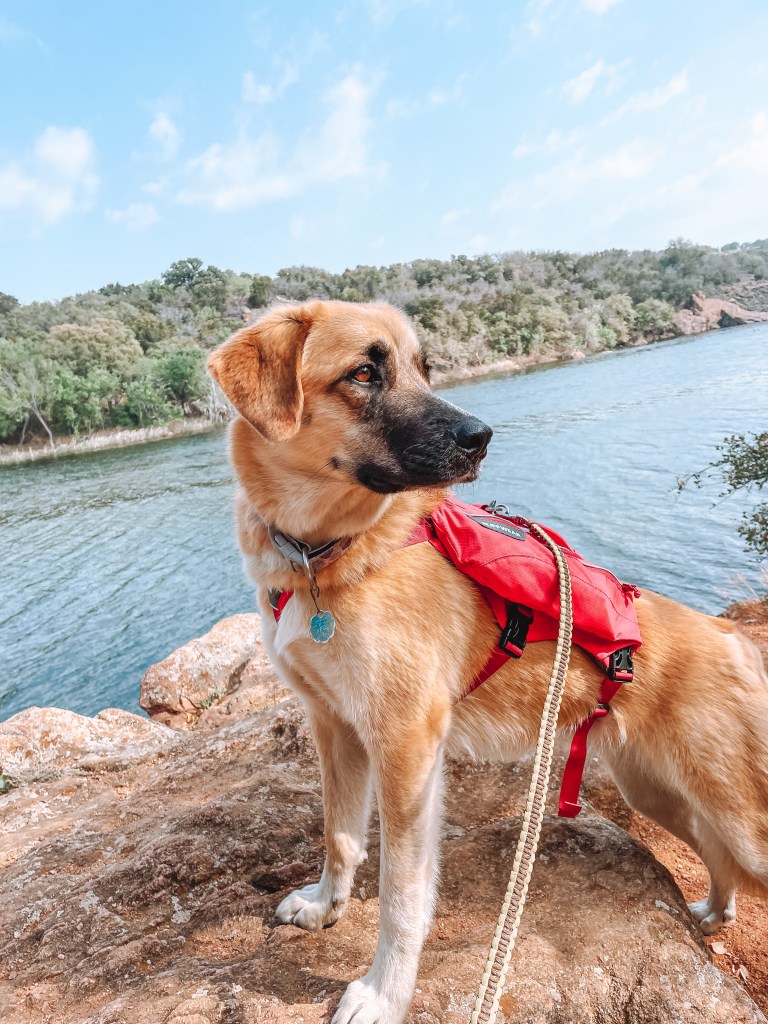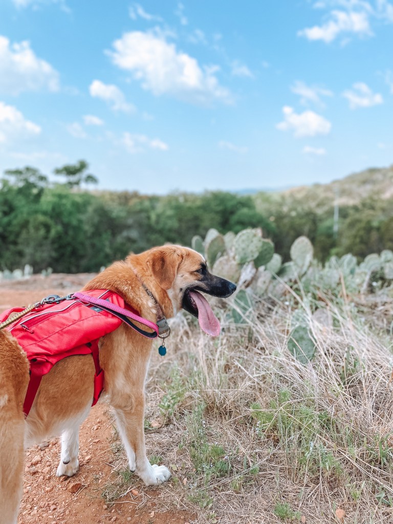 Before we hit the road to head out on our adventure, I made sure to outfit Lani for our trip. It’s important to carry enough water, and even food, for your pups when you take them on adventures with you, especially when in a very hot climate like Texas. I invested in a day pack from Ruffwear for my girl which allowed her to carry her own water, snacks, and poop bags (link to her pack, here, not sponsored I just love it!). Wearing a harness is not her favorite thing, but she got used to it, and having water easily accessible for her was really nice.