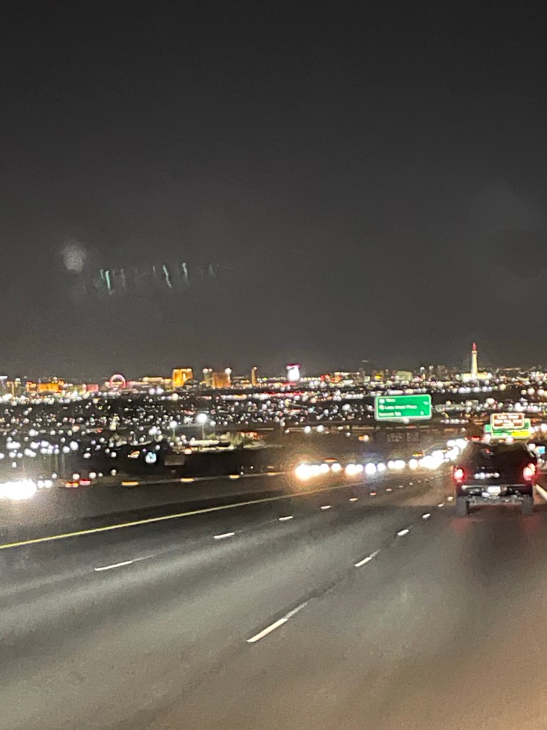It was pitch black out our windows, though, so we couldn’t see exactly what we were driving through. The only thing we could bring into focus were headlights, barricade railings along the roadside, and the flashing red dots that hovered in the sky from the tops of wind turbines. This was all we had to look at for what seemed like miles until the view in front of us opened up to reveal the valley full of all the dancing neon lights of Sin City!